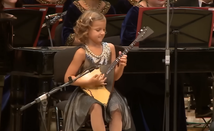 Quella stessa scintilla appare nella storia di una bambina di 7 anni di nome Anastasia, che ha stupito il suo pubblico eseguendo il classico brano folk russo “Valenki”. Si distingueva immediatamente — l’unica bambina tra gli adulti — mentre suonava al fianco del rinomata Orchestra Nazionale Accademica di Strumenti Popolari Russi.
