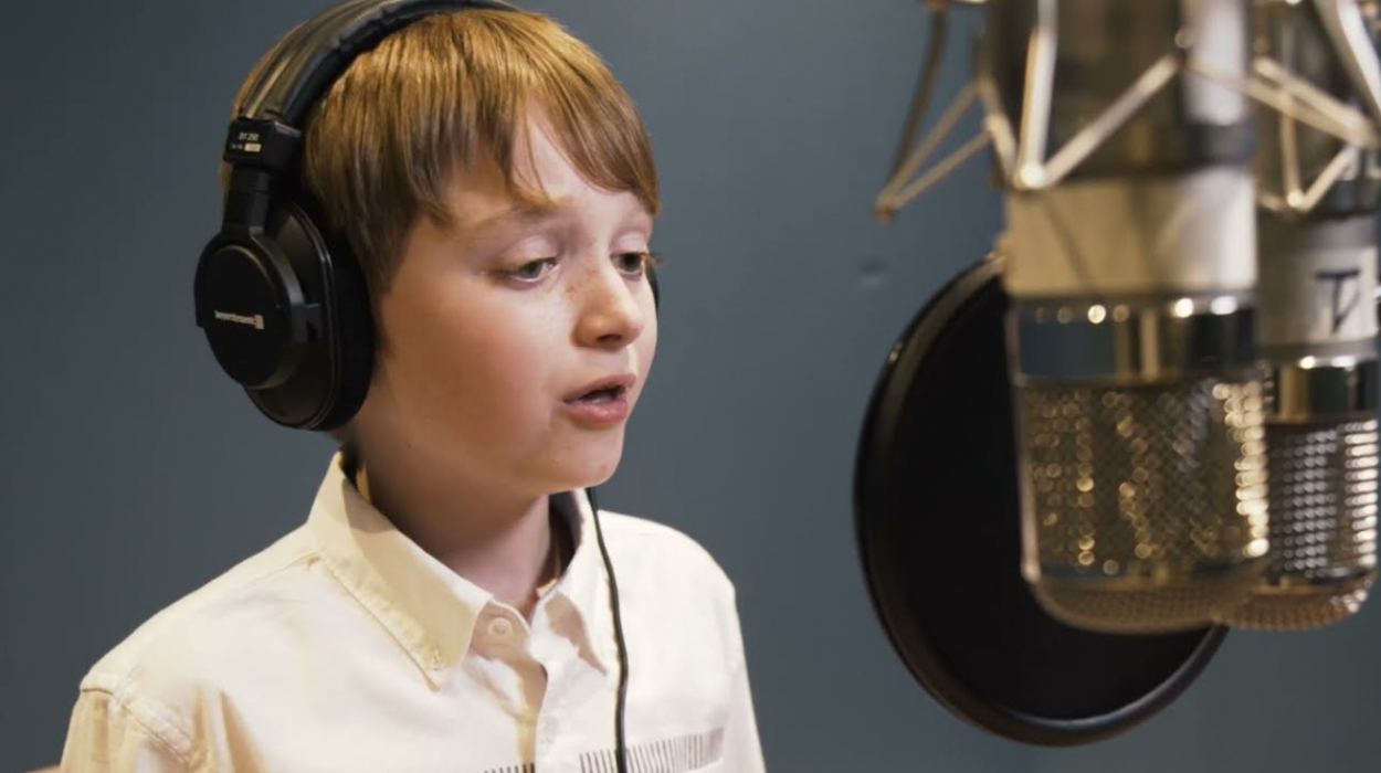 Cormac performs in the studio with a light blue background. He stands in front of a microphone wearing headphones as he sings. He wears a white collared shirt while he sings the famous song from the musical ‘Les Miserables.’
