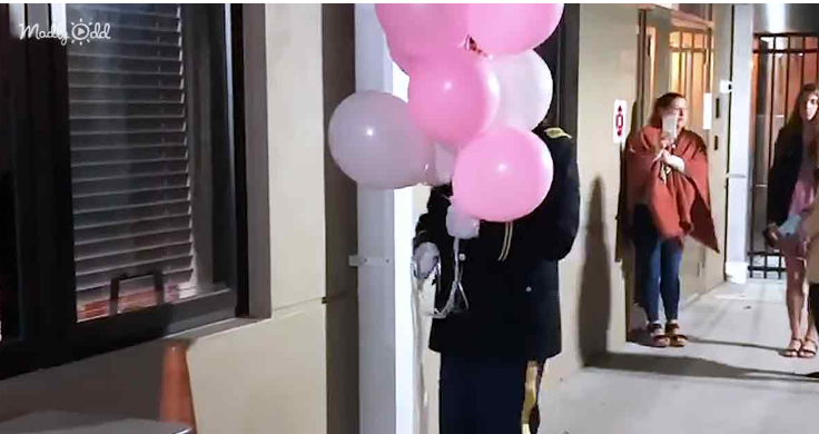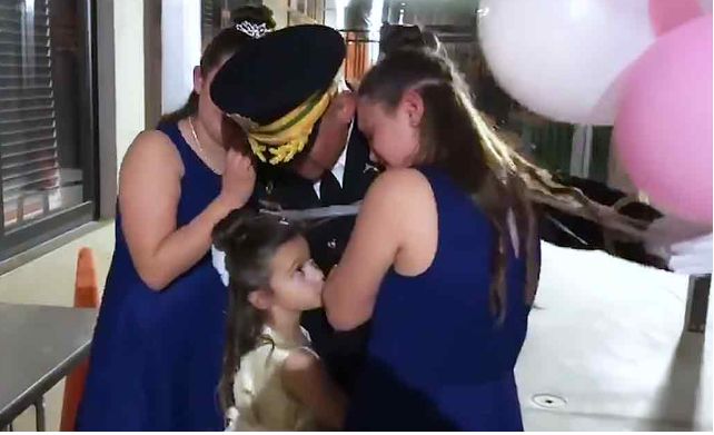 The girls had resigned to the fact that they wouldn’t see their dad that night. When the girls arrived, James was hiding in uniform behind a bunch of pink and white balloons. Their mom directed them to go in his direction, and as soon as they saw him, they screamed with joy!