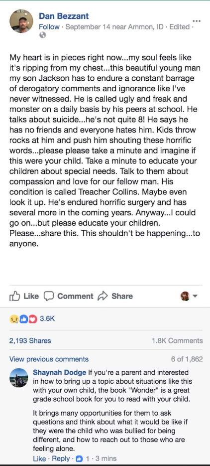 “My heart is in pieces right now.. my soul feels like it’s ripping from my chest.. this beautiful young man, my son Jackson, has to endure a constant barrage of derogatory comments and ignorance like i’ve never witnessed. He is called ugly, freak and monster on a daily basis by his peers at school. He talks about suicide.. he’s not even 8 yet! He says he has no friends and everyone hates him. Kids throw rocks at him and push him, shouting these horrific words.. please please take a minute and imagine if this was your child. Take a minute to educate your children about special needs. Talk to them about compassion and love for our fellow man. His condition is called Treacher Collins. Maybe even look it up. He’s endured horrific surgery and has several more in the coming years. Anyway, I could go on.. but please educate your children. Please.. share this. This shouldn’t be happening.. to anyone.”