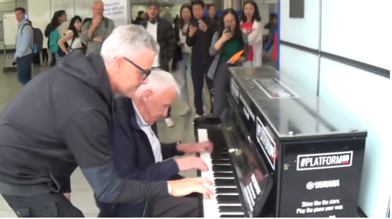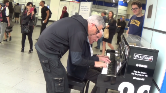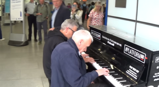 More and more people stop to listen to the loud, boisterous piano duet in the middle of a station. Cellphones are used to film the event, which now has millions and millions of views.