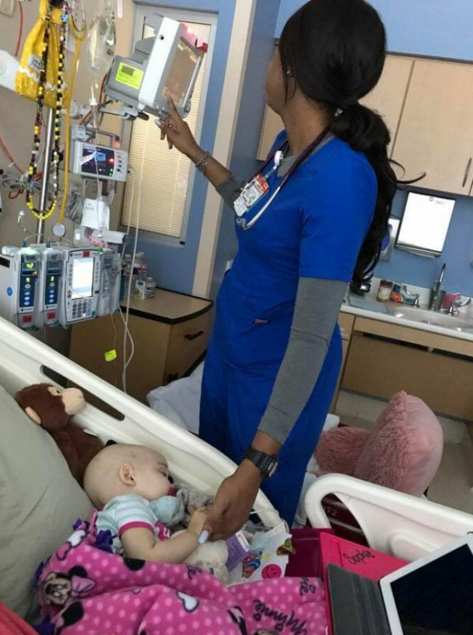 After taking a picture of the nurse with her back to her, Shelby published the photo on a Facebook page that the parents set up to document Sophie’s struggle against the disease.