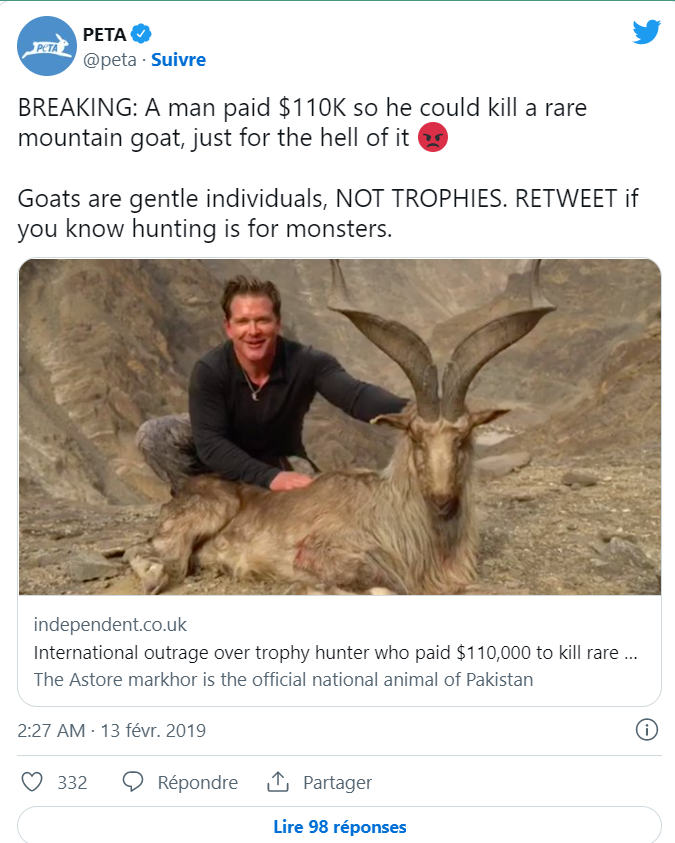 This time, an American hunter has reportedly paid $110,000 for a permit to kill a rare mountain goat in Pakistan, before squatting over the creature for pictures.