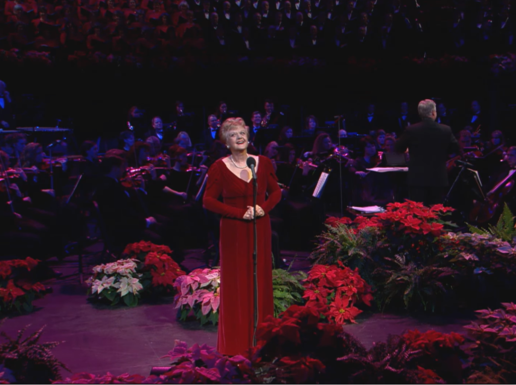 Angela stands in front of a large orchestra wearing a dark red velvet dress. The stage is adorned with red, pink, and white flowers. Singing with Angela is the Tabernacle Choir.
