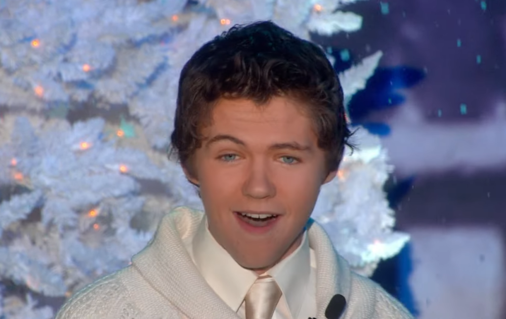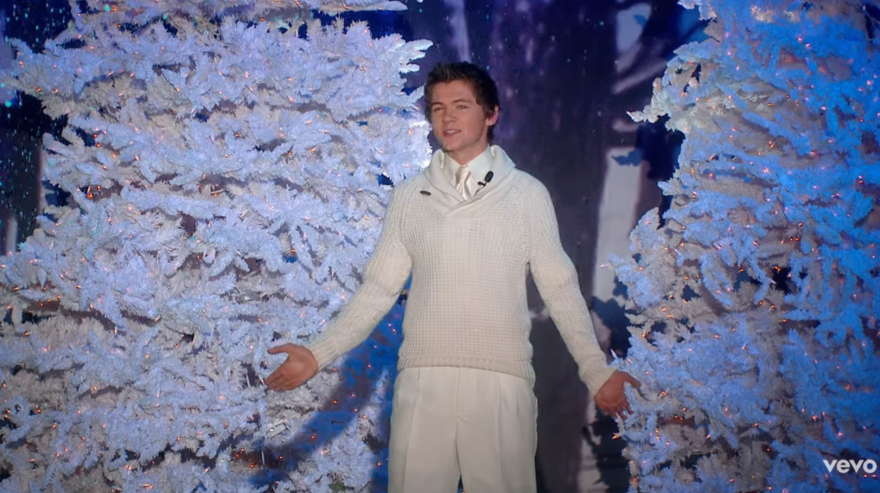 McGinty makes a dramatic entry from behind the White Christmas trees. The singer looks dashing in a white shirt, trousers, and a pullover. McGinty starts to sing confidently, and everyone in the crowd is mesmerized by his innocent looks and fantastic voice.