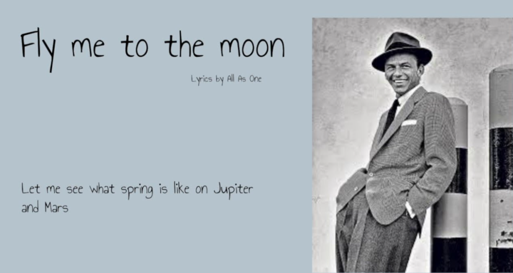 Frank receives tremendous applause before the song starts. He begins singing, “Fly me to the moon. Let me play among the stars. Let me see what spring is like on Jupiter and Mars. In other words, hold my hand. In other words, baby, kiss me.”