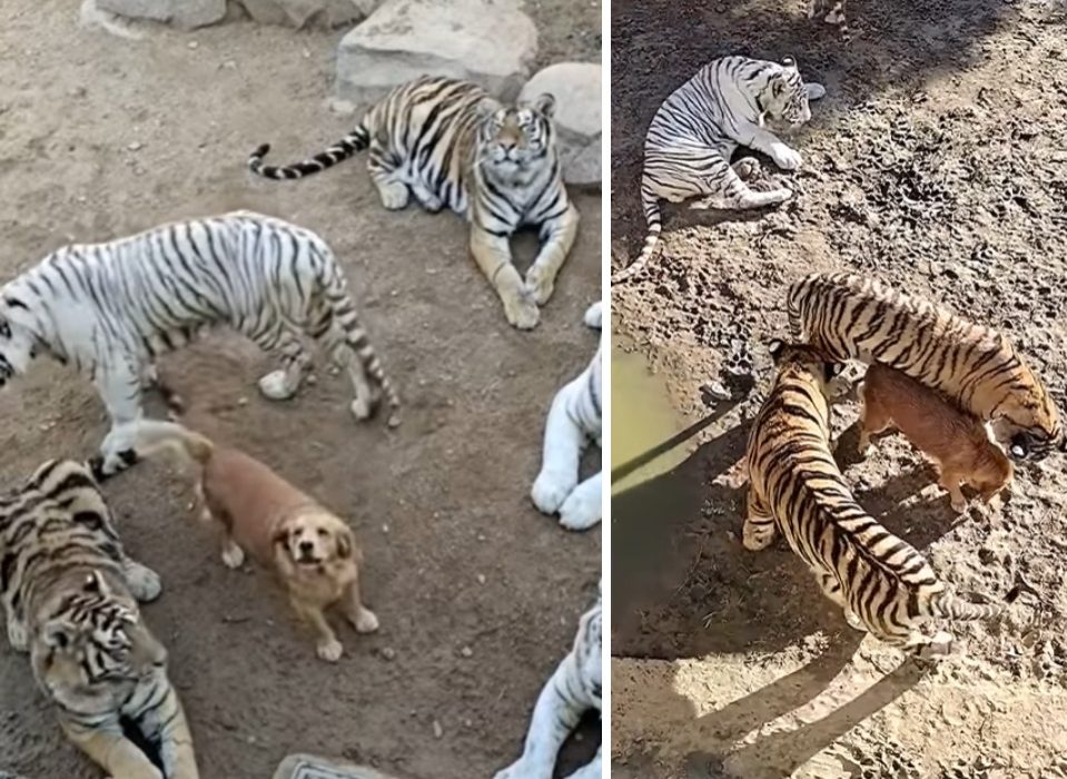 The white tiger went very close to the dog and hide behind a stone, to everybody’s surprise the tiger did not attack the dog, but started to fawn on it. Afterwards the other tigers came close to the dog and did the same as the white tiger did. Soon the poor dog was surrounded by 4 predators, but they did not attack. They wanted to get their share of affection from the dog.