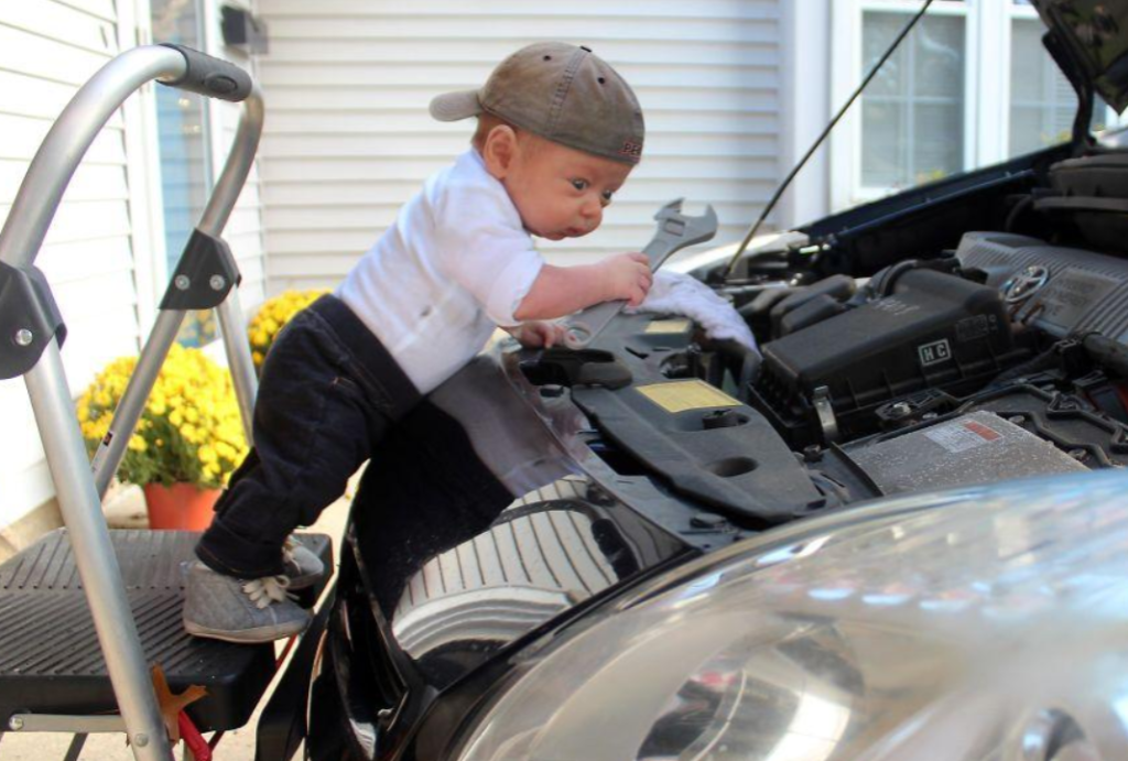 Mac takes pictures of his newborn son Ryan and does photoshop to make him look like a newborn, actually doing a man’s job. He did it for his daughter and decided that his son deserved it too.