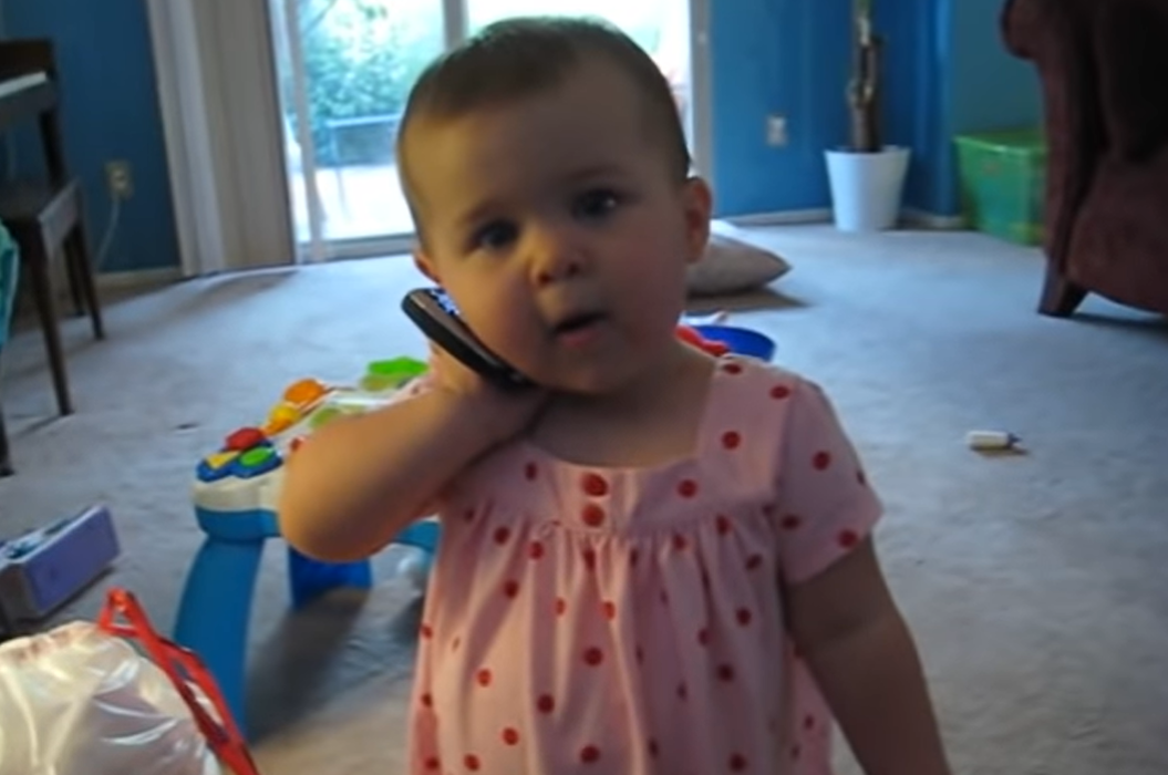 Mom lovingly records all the fun going down as the girl yammers away in a language only she knows and can speak with daddy. “This is Emilia talking to daddy on the phone,” says mom, giggling and laughing away.