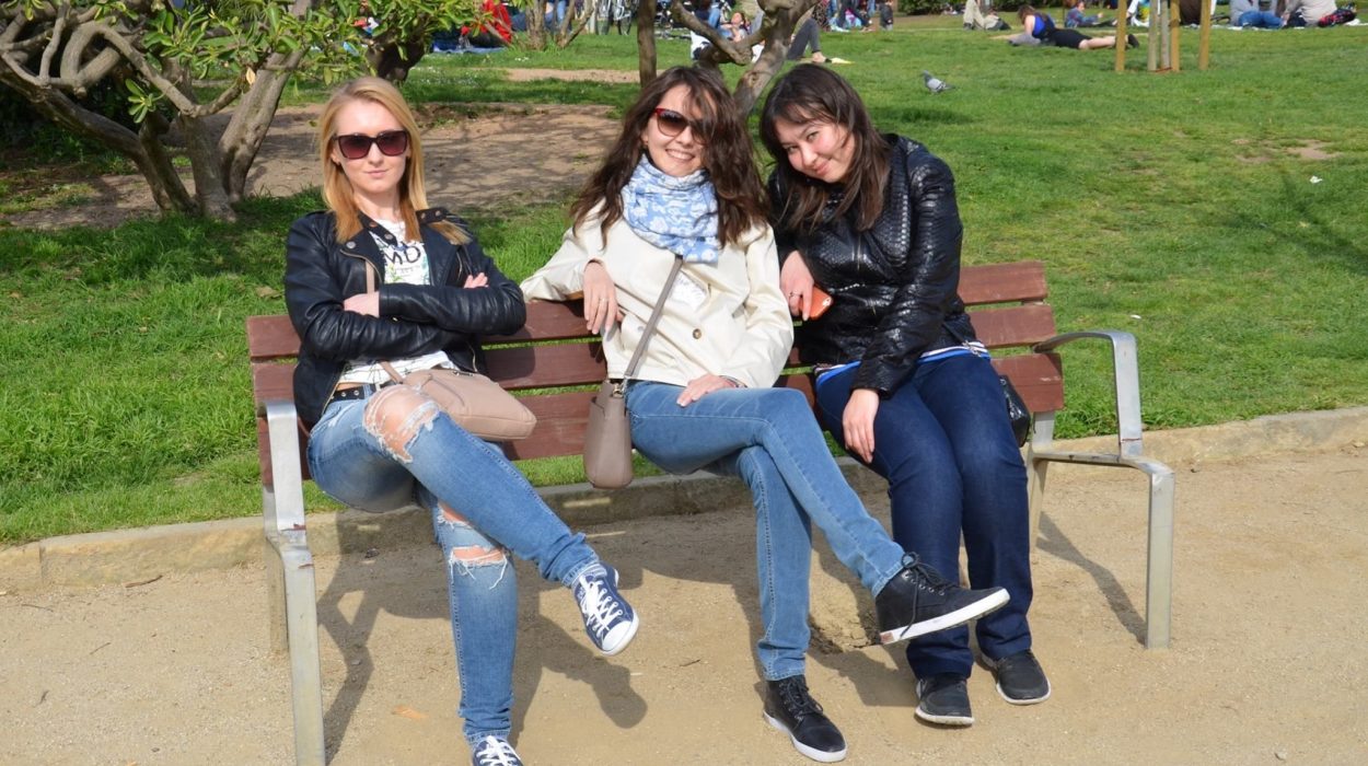 And now take another good look at the bench. Just not on the back, but on the seat. Yes, in fact, the seat is completely absent and the girls seem to be hanging in the air, leaning only on the ground and on the back!