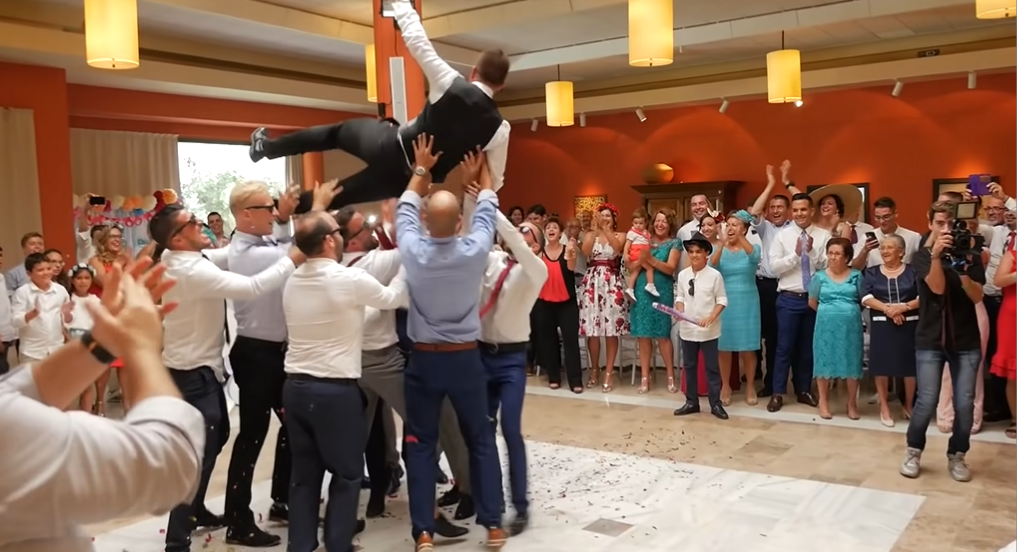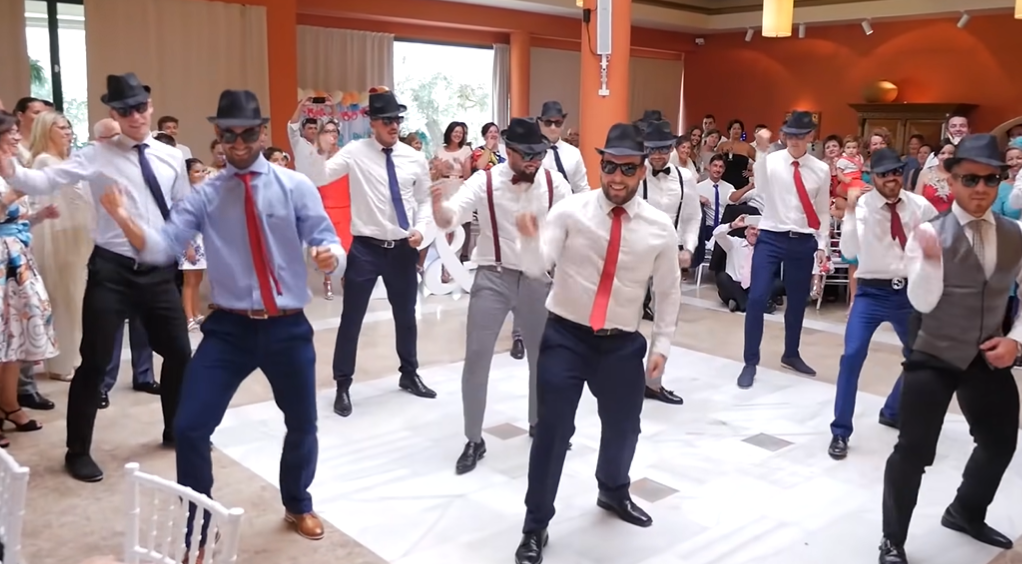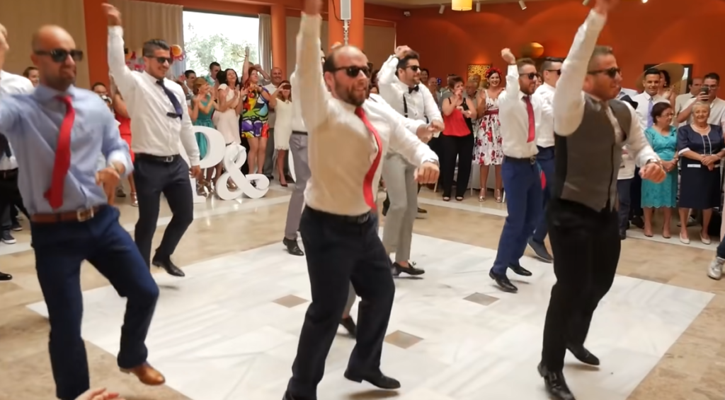 The crowd erupted in applause as the song concluded, but the festivities were far from over. The wedding party continued with finger-wriggling moves to Beyoncé’s “Single Ladies” and transitioned into a dance featuring the Backstreet Boys’ hit “rock your body.” The grand finale involved aerial acrobatics set to “Gangnam Style.”
