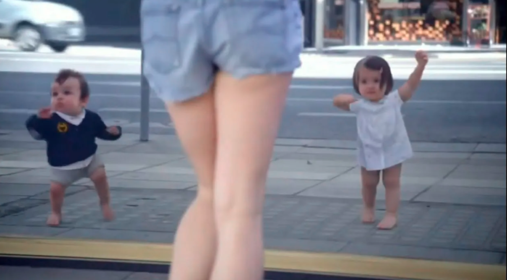 In this heartwarming clip, grown-ups walking along a lively street are surprised to see their ‘inner babies’ staring back at them from a shop window. Naturally, these adults begin to dance, their baby reflections mirroring their every move. The result is both hilarious and wonderfully creative, blending the worlds of adulthood and childhood in a delightful spectacle.