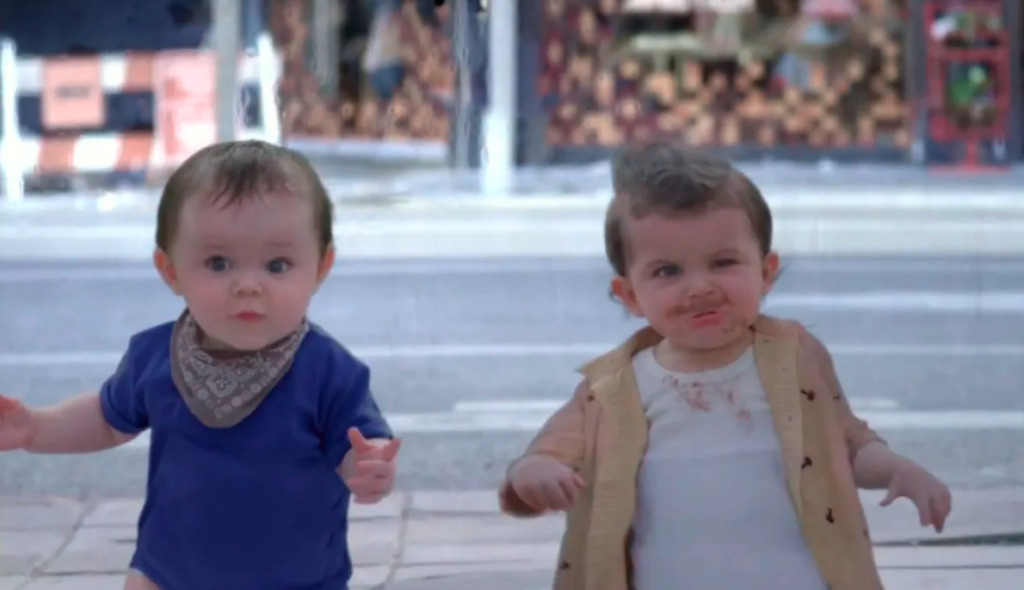 Watching these adult characters interact with their baby selves through dance is not only amusing but also reminiscent of classic comedic routines. It brings to mind the iconic Charlie Chaplin scene where he encounters his reflection acting independently. But let’s return to the present-day charm of this video!