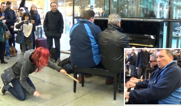 As the crowd swelled, a young red-haired woman stepped in with a pair of drumsticks, adding a vibrant rhythm by drumming on the floor. Her spontaneous contribution elevated the performance, turning the impromptu jam session into a full-fledged collaboration that electrified the station.