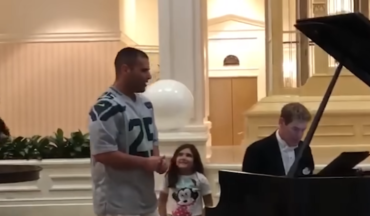 At first glance, you’d never expect it. Just a regular dad in a football jersey and khaki shorts, standing in the middle of a Disney resort. But then he starts to sing—Ave Maria—and suddenly, the whole place falls silent. His voice is powerful, rich, and completely unexpected.
