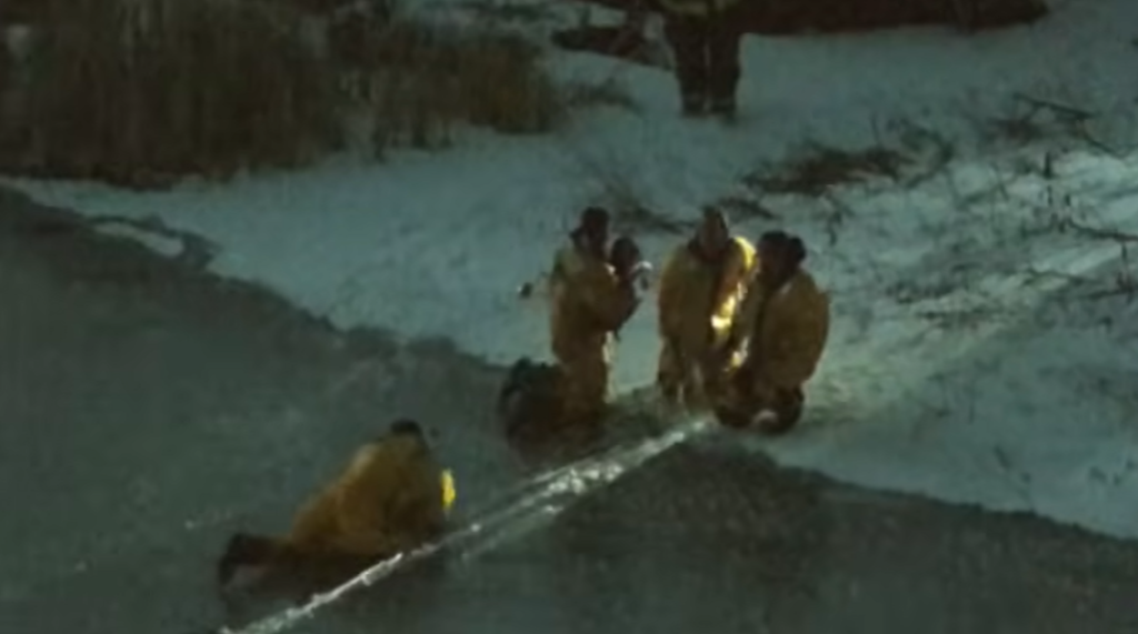 The Wellesley Police Department released drone footage of the dramatic scene, capturing the moment firefighters risked their own safety, crawling across the fragile ice to reach the stranded pair.
