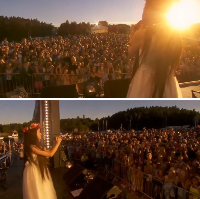 As the sun began to dip behind the stage, casting golden rays across the sky, a quiet hush settled over the crowd. The evening was already magical — the kind of moment where nature and music seem to meet halfway. Onto that stage walked an 8-year-old girl, barefoot, calm, and carrying an energy much bigger than her small frame.